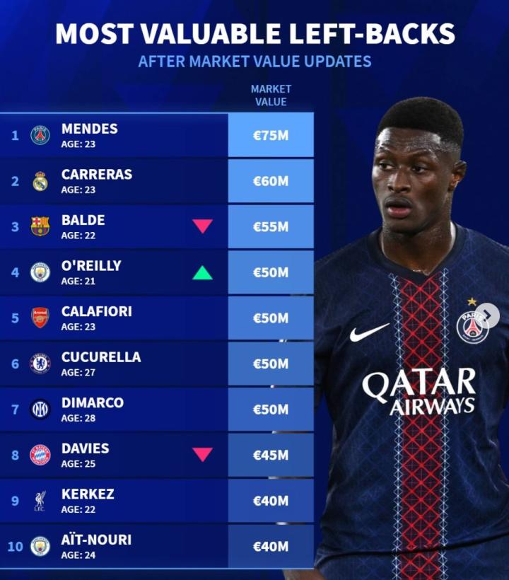 扫描下载懂球帝首页>动态> 德转列左后卫身价前10:门德斯7500万第1,卡雷拉斯6000万第2