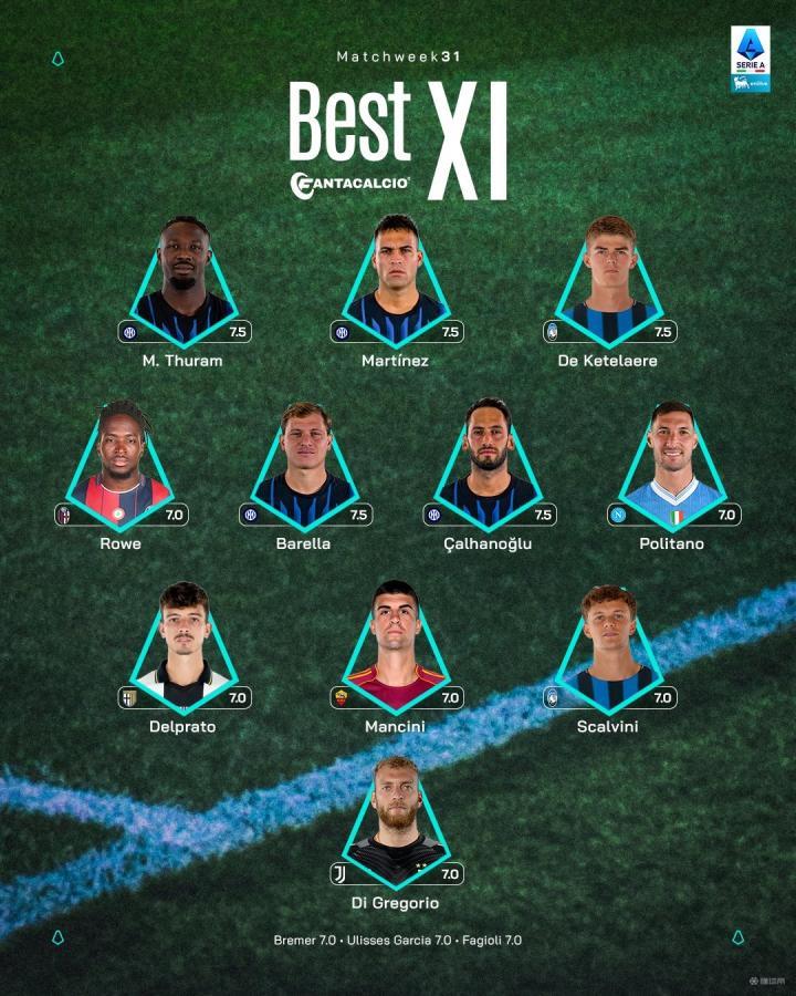 扫描下载懂球帝首页>动态> 意甲第31轮最佳阵容:劳塔罗领衔国米4人,迪格雷戈里奥入选