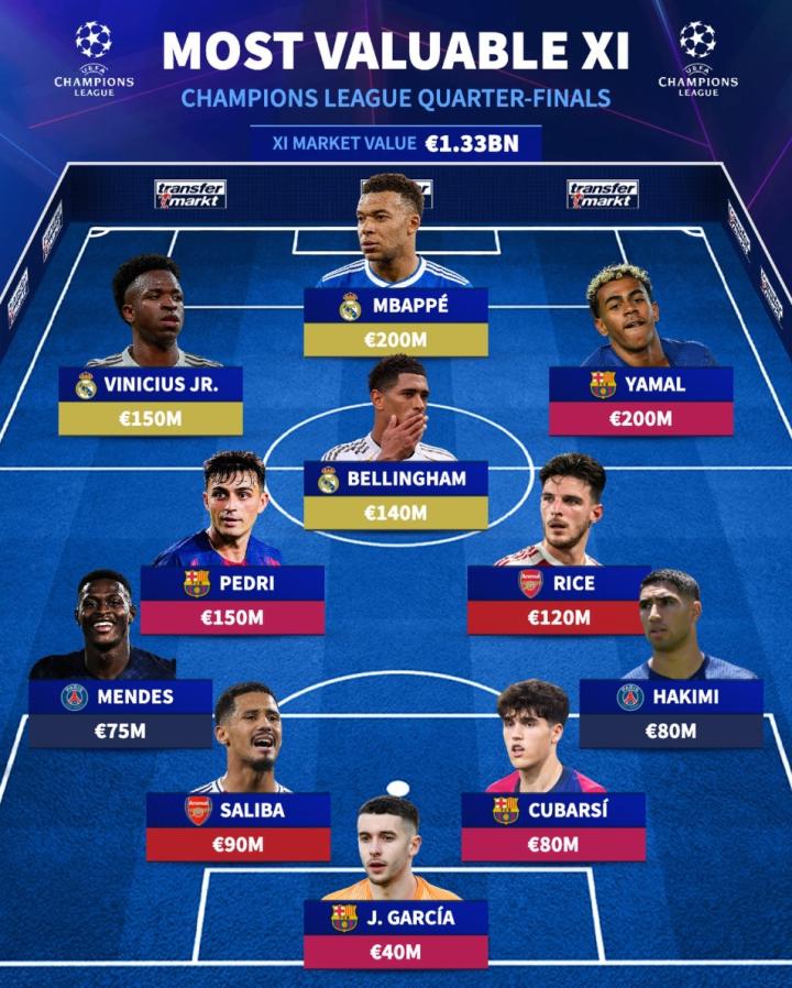 扫描下载懂球帝首页>动态> 欧冠1/4决赛最贵阵容:姆巴佩、亚马尔领衔,巴萨4人皇马3人