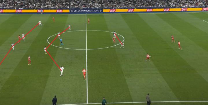 然而,上半场让人印象更为深刻的,并不是拜仁的进攻,反而是皇马的反击,他们每隔几分钟就能打出一次反击,从而在20分钟后,丢球之前,总计打出了三次不错的进攻: