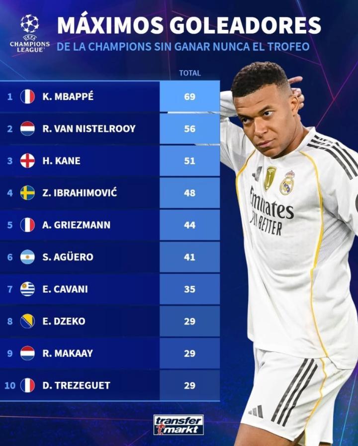 扫描下载懂球帝首页>动态> 欧冠从未夺冠球员射手榜:姆巴佩69球第1,凯恩51球第3