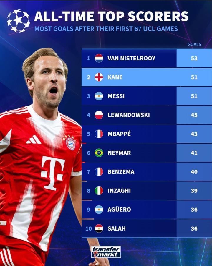 欧冠从未夺冠球员射手榜:姆巴佩69球第1,凯恩51球第3