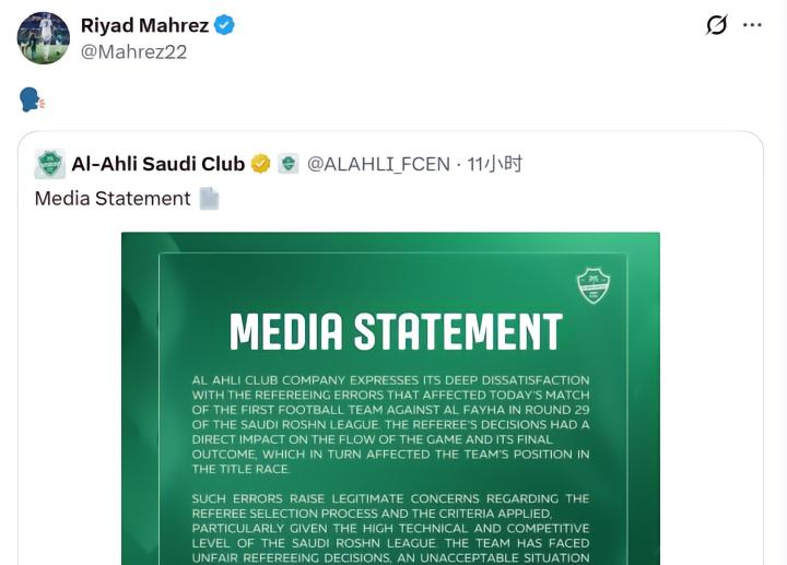 赛后,吉达国民俱乐部发布官方声明,对本场比赛的裁判执法提出强烈不满,并就多次关键判罚表达质疑,要求相关方面给出解释。随后,马赫雷斯在个人社交媒体上转发该声明,以实际行动声援俱乐部的立场,表达对争议判罚的不满态度,也进一步凸显了球队内部在此问题上的一致声音。