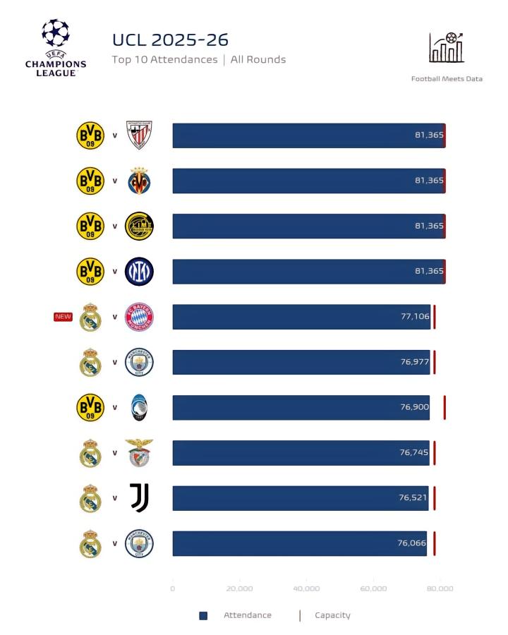 扫描下载懂球帝首页>动态> 本赛季欧冠上座人数榜前十:多特包揽前四,皇马vs拜仁第五