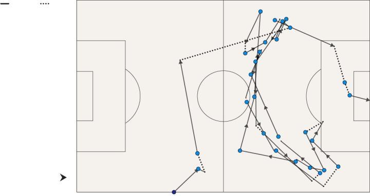 将这与巴黎圣日耳曼的统治力和观赏性形成对比。在一些观察者看来,克瓦拉茨赫利亚是我们这个时代最接近贝斯特的球员。他有那样的步态。他有那样的胡子。他还有那样的脚法——正如他在那个由27脚传递完成的进球中所展示的那样(如下所示),为德西雷-杜埃的首开纪录锦上添花。