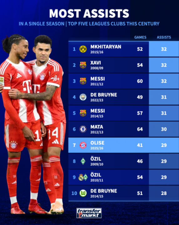 扫描下载懂球帝首页>动态> 懂球号> 29次助攻还不够?拜仁边锋奥利塞剑指单赛季助攻王