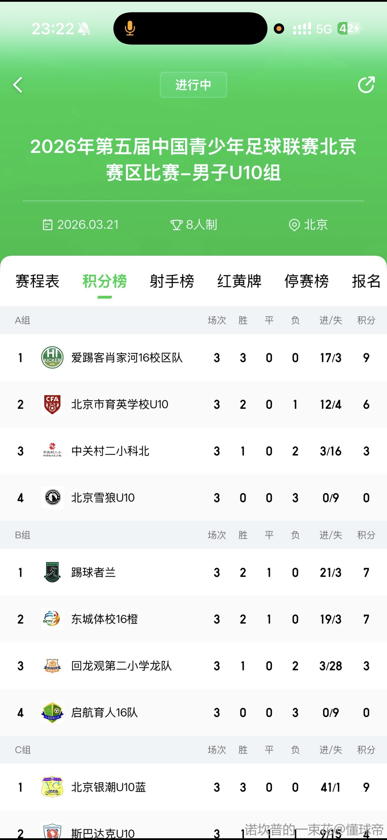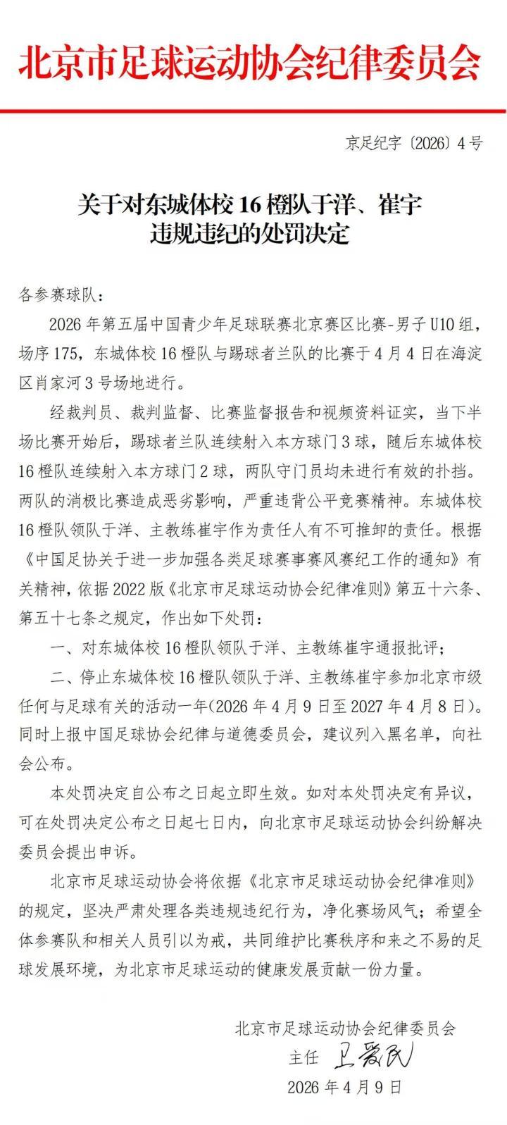 4月9日,北京市足协官方消息,在中青赛北京赛区U10组东城体校16橙队与踢球者兰队的比赛中,双方在下半场连续互射自家球门,均被取消比赛资格。