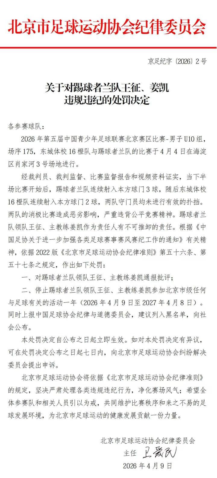 罚单内容显示,在北京赛区一场U10中青赛比赛中,踢球者兰队队员连续射入本方球门3球,对手东城体校16橙队随后连续射入本方球门2球。