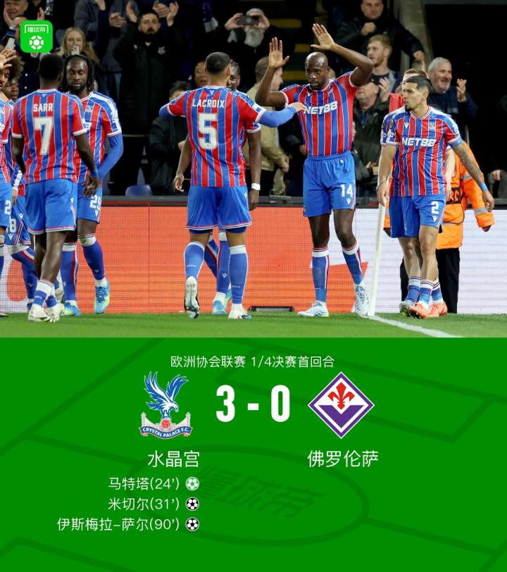 扫描下载懂球帝首页>动态> 水晶宫3-0佛罗伦萨,马特塔点射,米切尔、萨尔破门