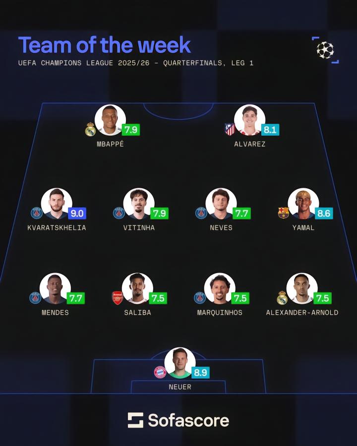 欧冠本周最佳阵容:亚马尔、阿尔瓦雷斯、诺伊尔、哈弗茨在列