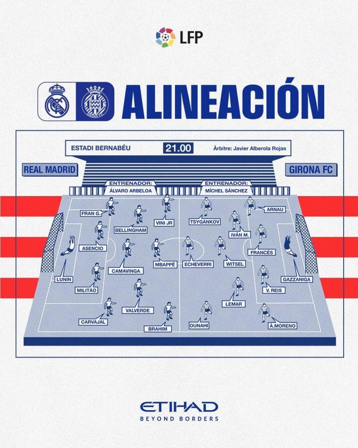 皇马vs赫罗纳:姆巴佩、维尼修斯首发,维特塞尔、勒马尔出战