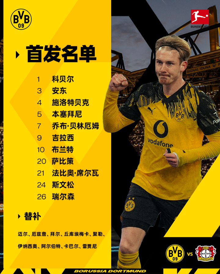 04-11 20:58多特vs勒沃库森:吉拉西、小贝林厄姆首发,科法内出战