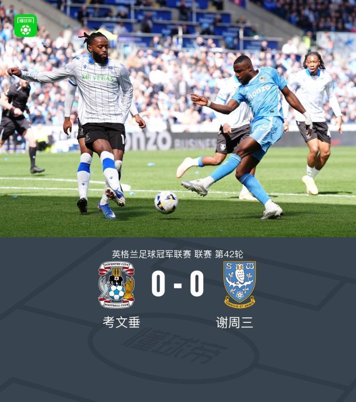 北京时间4月11日,英格兰足球冠军联赛第42轮,考文垂主场对阵谢周三。比赛中,基钦抢点头槌遭门线解围,西姆斯、杰里-耶茨失良机。最终,考文垂0-0谢周三。