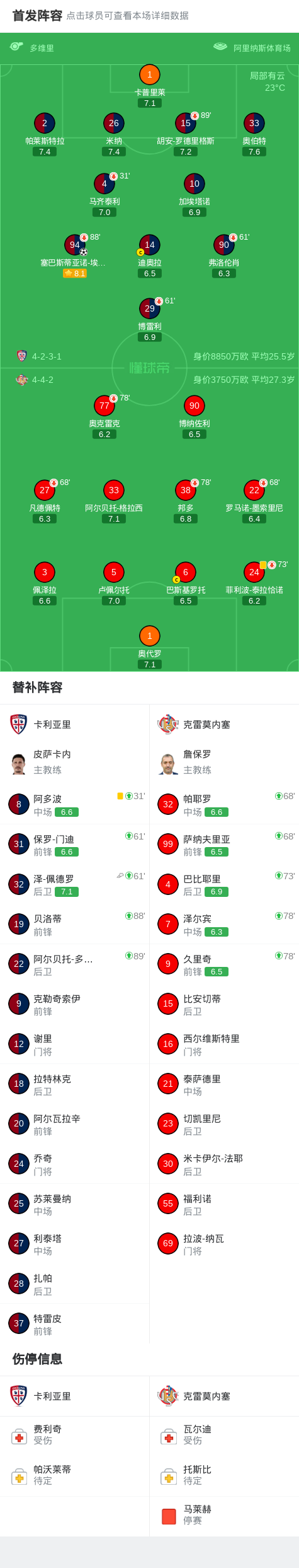 北京时间4月11日意大利足球顶级联赛 联赛 第32轮,卡利亚里主场对阵克雷莫内塞。卡利亚里塞巴斯蒂亚诺-埃斯波西托破门。最终比分卡利亚里 1-0 克雷莫内塞。