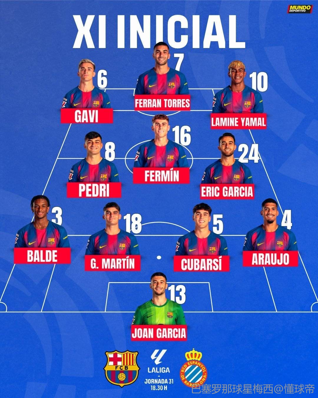 我预测的一点都没错,库巴西,马丁,加西亚,费尔明,佩德里,亚马尔是主力,加维,巴尔德,费兰,阿劳霍是替补,其中库巴西停赛欧冠肯定上不了,不能算主力,这就是典型的五主力+五替补+门将,如果进展顺利,马丁,埃里克,费尔明,佩德里,亚马尔可以被埃斯帕特,德容,奥尔莫,卡萨多,巴尔德吉换下!进展不顺就换上拉什福德,坎塞洛,莱万,孔德,现在5换人,这种比赛5主力+5替补就是最好的配置,要输了就上主力,稳了就下主力