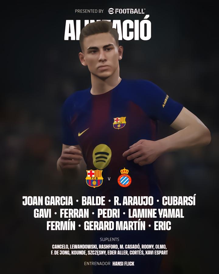 扫描下载懂球帝首页>动态> 巴萨vs西班牙人:佩德里领衔,亚马尔、费尔明、加维出战