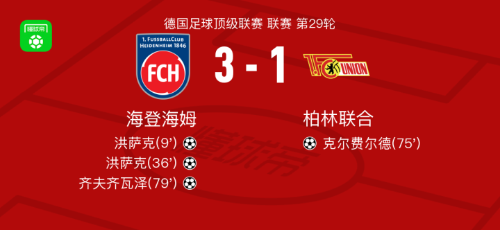 北京时间4月11日德国足球顶级联赛 联赛 第29轮,海登海姆主场对阵柏林联合。海登海姆洪萨克梅开二度,齐夫齐瓦泽破门。柏林联合克尔费尔德破门。最终比分海登海姆 3-1 柏林联合。