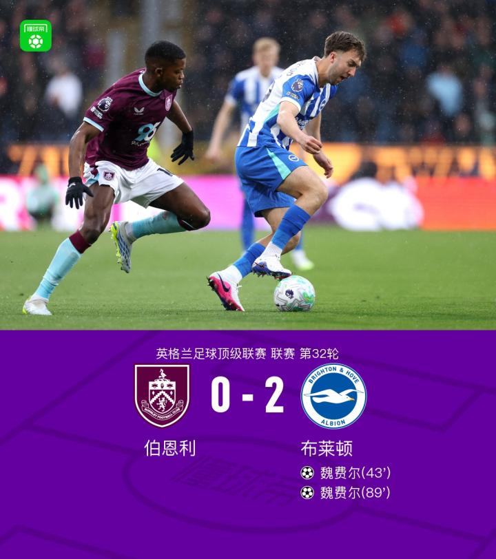 扫描下载懂球帝首页>动态> 伯恩利两进球被吹0-2不敌布莱顿,魏费尔梅开二度