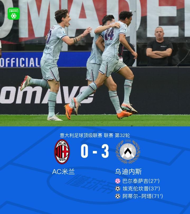 扫描下载懂球帝首页>动态> 剑南春丨米兰0-3乌迪内斯,埃克伦坎普传射,阿塔破门+造乌龙