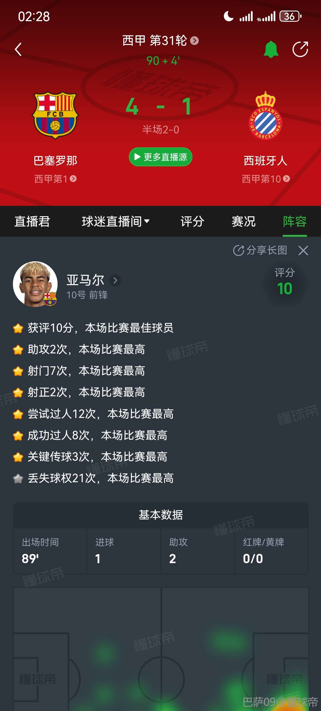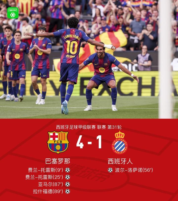 扫描下载懂球帝首页>动态> 剑南春|巴萨4-1西班牙人,亚马尔两传一射,费兰双响