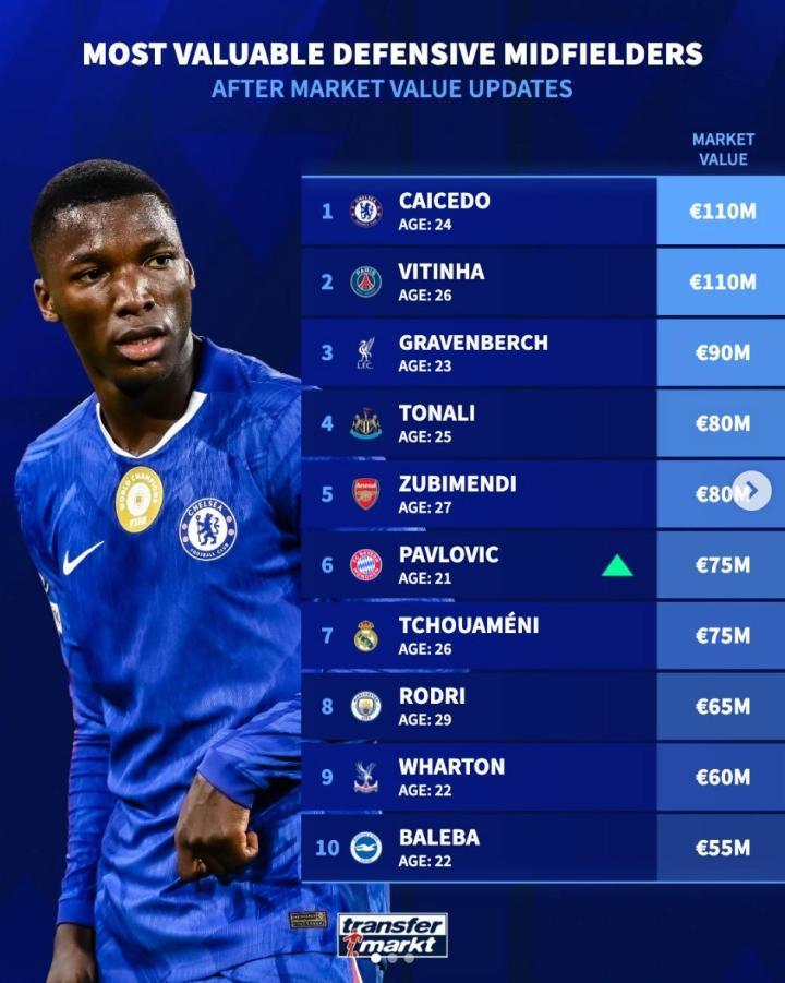 扫描下载懂球帝首页>动态> 德转列世界足坛后腰身价前10:凯塞多、维蒂尼亚1.1亿并列第1