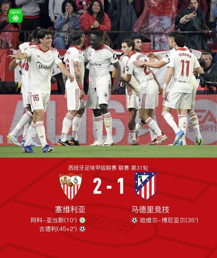 04-12 04:07半场:塞维利亚2-1马竞,亚当斯点射,古德利建功