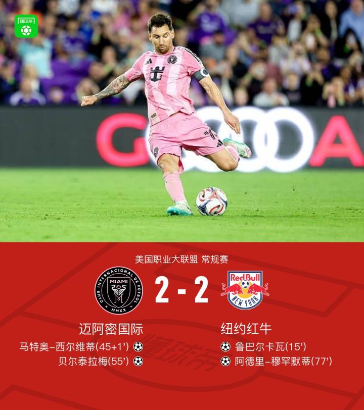 北京时间4月12日美国职业大联盟常规赛,迈阿密国际主场对阵纽约红牛。鲁瓦尔卡巴首开记录,德保罗助攻西尔维蒂扳平比分,易边再战贝尔泰拉梅反超比分,穆罕默蒂破门扳平,补时阶段贝尔泰拉梅绝杀球被吹。最终比分迈阿密国际 2-2 纽约红牛。