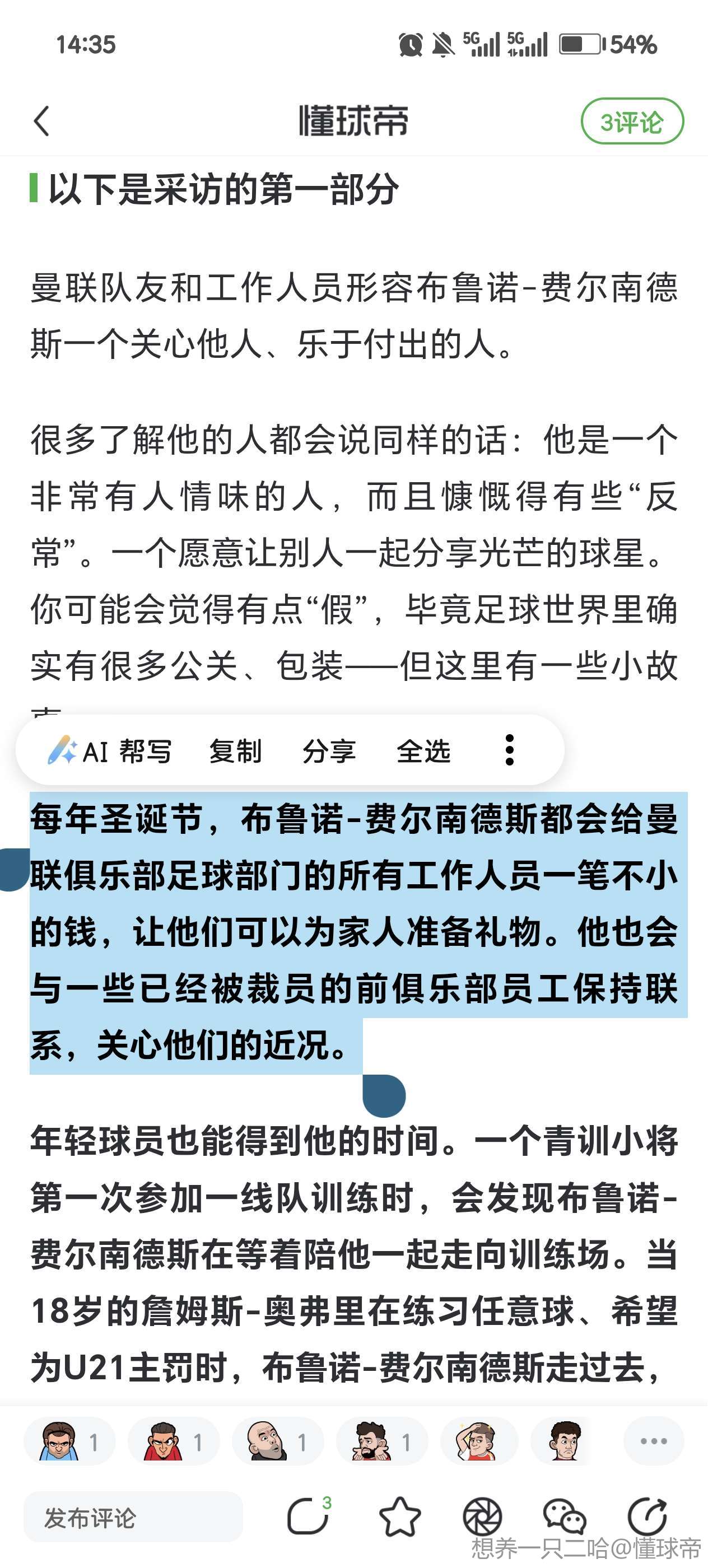 每年圣诞节,布鲁诺-费尔南德斯都会给曼联俱乐部足球部门的所有工作人员一笔不小的钱,让他们可以为家人准备礼物。他也会与一些已经被裁员的前俱乐部员工保持联系,关心他们的近况。