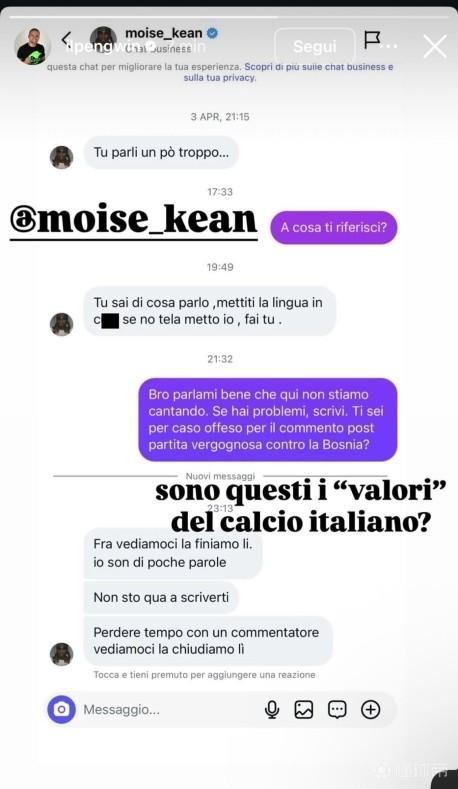 扫描下载懂球帝首页>动态> 某国外博主称遭小基恩私信恐吓:这就是意大利足球的价值观吗