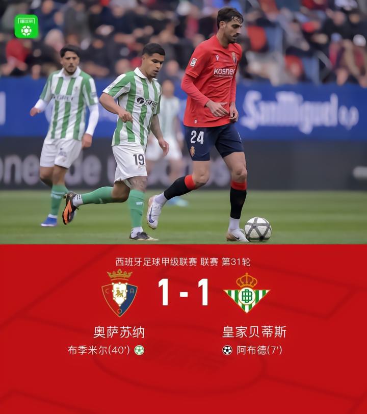 北京时间4月12日,西班牙足球甲级联赛第31轮,奥萨苏纳主场对阵皇家贝蒂斯。比赛中,阿布德远射闪击,布季米尔点射扳平比分,安东尼染黄+累计五黄下轮停赛。最终,奥萨苏纳1-1贝蒂斯。