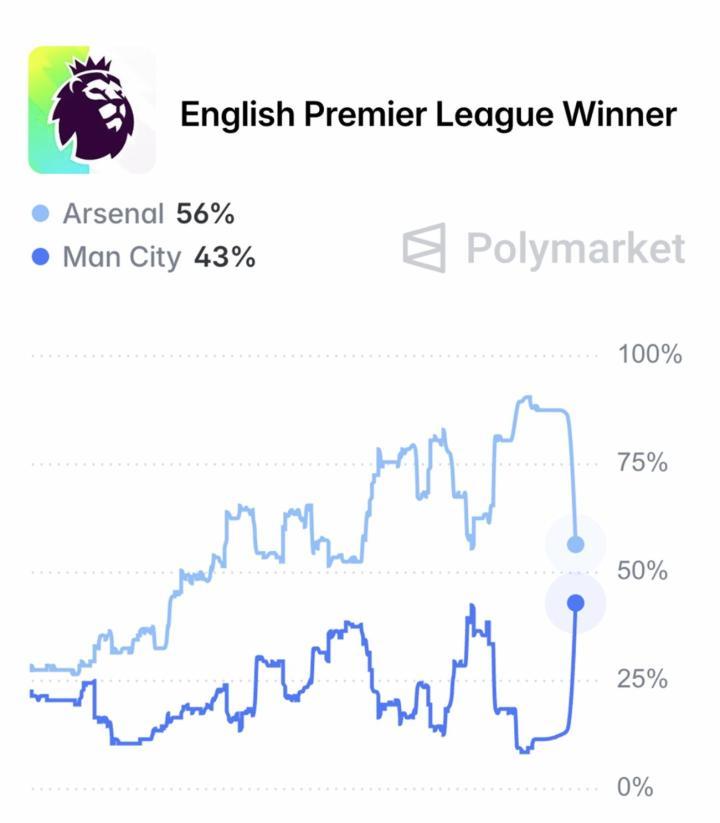 扫描下载懂球帝首页>动态> 英超最新夺冠概率:阿森纳从最高91%跌至56%,曼城升至43%