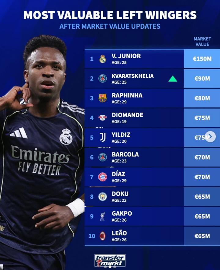 扫描下载懂球帝首页>动态> 德转左边锋身价前10:维尼修斯1.5亿第一、KK、拉菲尼亚二三位
