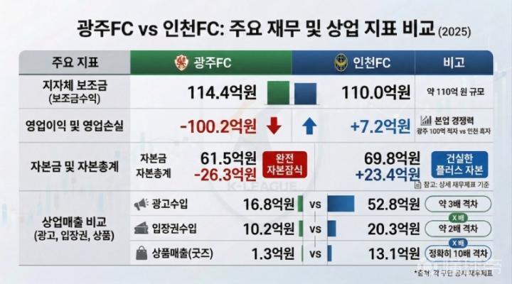 俱乐部财务恶化的重要原因之一,在于商业收入结构的薄弱。即便光州FC在2025赛季征战K1联赛,其市场化收入能力却明显落后于同样获得韩国地方政府补贴、但身处次级联赛的仁川FC。
