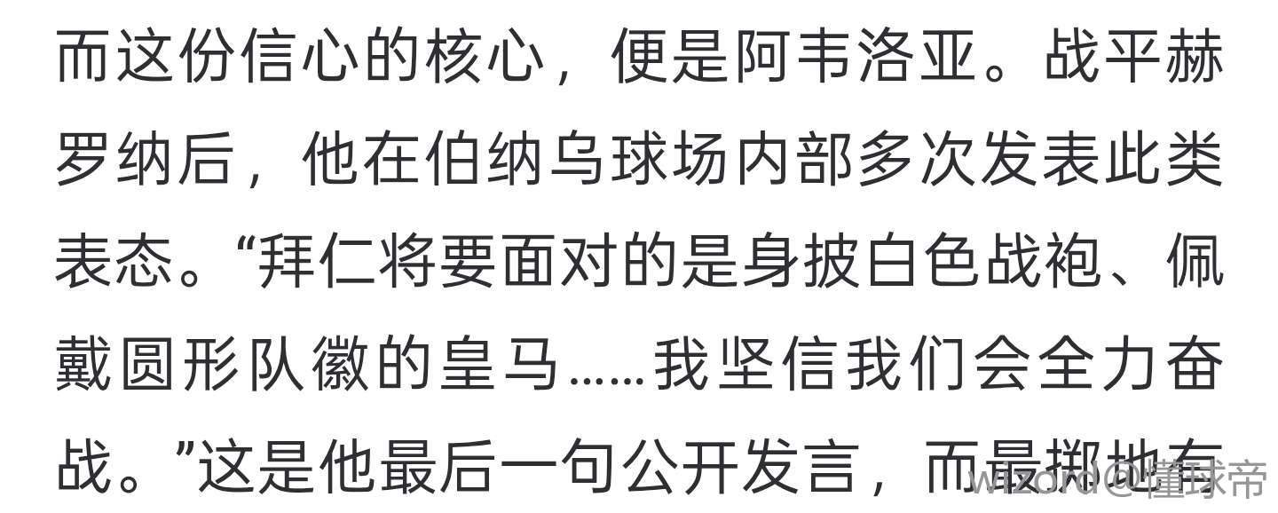 而这份信心的核心,便是阿韦洛亚。战平赫罗纳后,他在伯纳乌球场内部多次发表此类表态。“拜仁将要面对的是身披白色战袍、佩戴圆形队徽的皇马……我坚信我们会全力奋战。”这是他最后一句公开发言,而最掷地有声的是第一句:“我们必须付出巨大的努力……这是属于我们的比赛,我们目标明确。要前往德国争胜,满怀信念,拼到最后。”这些公开言论,他也在私下场合多次提及。