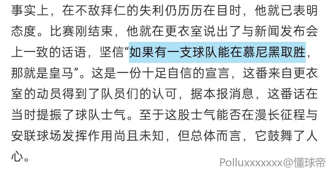 事实上,在不敌拜仁的失利仍历历在目时,他就已表明态度。比赛刚结束,他就在更衣室说出了与新闻发布会上一致的话语,坚信“如果有一支球队能在慕尼黑取胜,那就是皇马”。这是一份十足自信的宣言,这番来自更衣室的动员得到了队员们的认可,据本报消息,这番话在当时提振了球队士气。至于这股士气能否在漫长征程与安联球场发挥作用尚且未知,但总体而言,它鼓舞了人心。