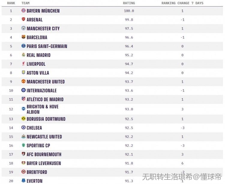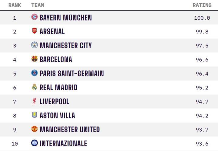 扫描下载懂球帝首页>动态> OPTA全球俱乐部实力榜:拜仁居首阿森纳次席,前十英超占5席