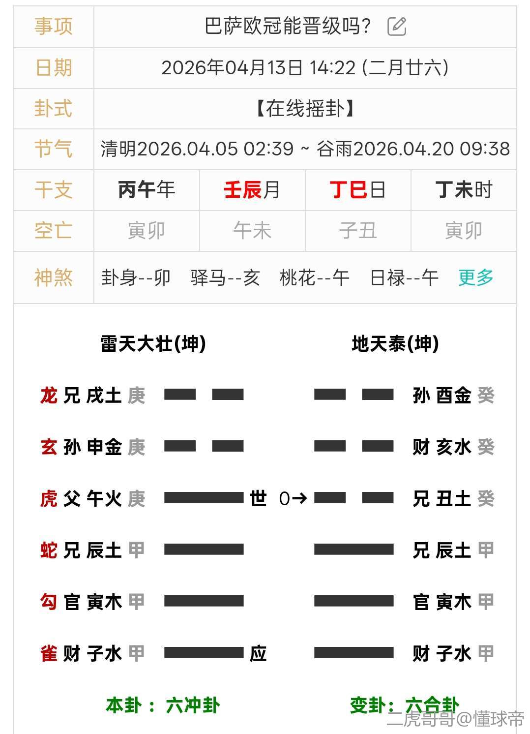 小伙子,好好踢,我已经问了一下卦,巴萨能否晋级?得雷天大壮之地天泰卦,真是让我有点意外。原卦虽父母持世但被应爻相克,主场输球。但父母爻化兄弟丑土反而又克应爻妻财子水,且兄弟丑土得日月相助力量大增,这样看来巴萨客场会扭转局势击败马竞晋级???真是有点不可思议!!到时候看看应验。