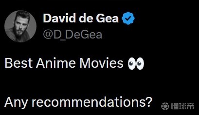 北京时间4月14日,佛罗伦萨门将德赫亚通过个人社交媒体向网友征求动漫电影推荐。