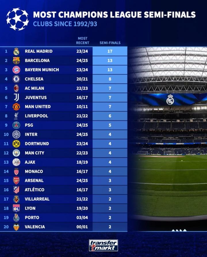 扫描下载懂球帝首页>动态> 欧冠92年改制后晋级半决赛次数:皇马17次第1,巴萨、拜仁第2
