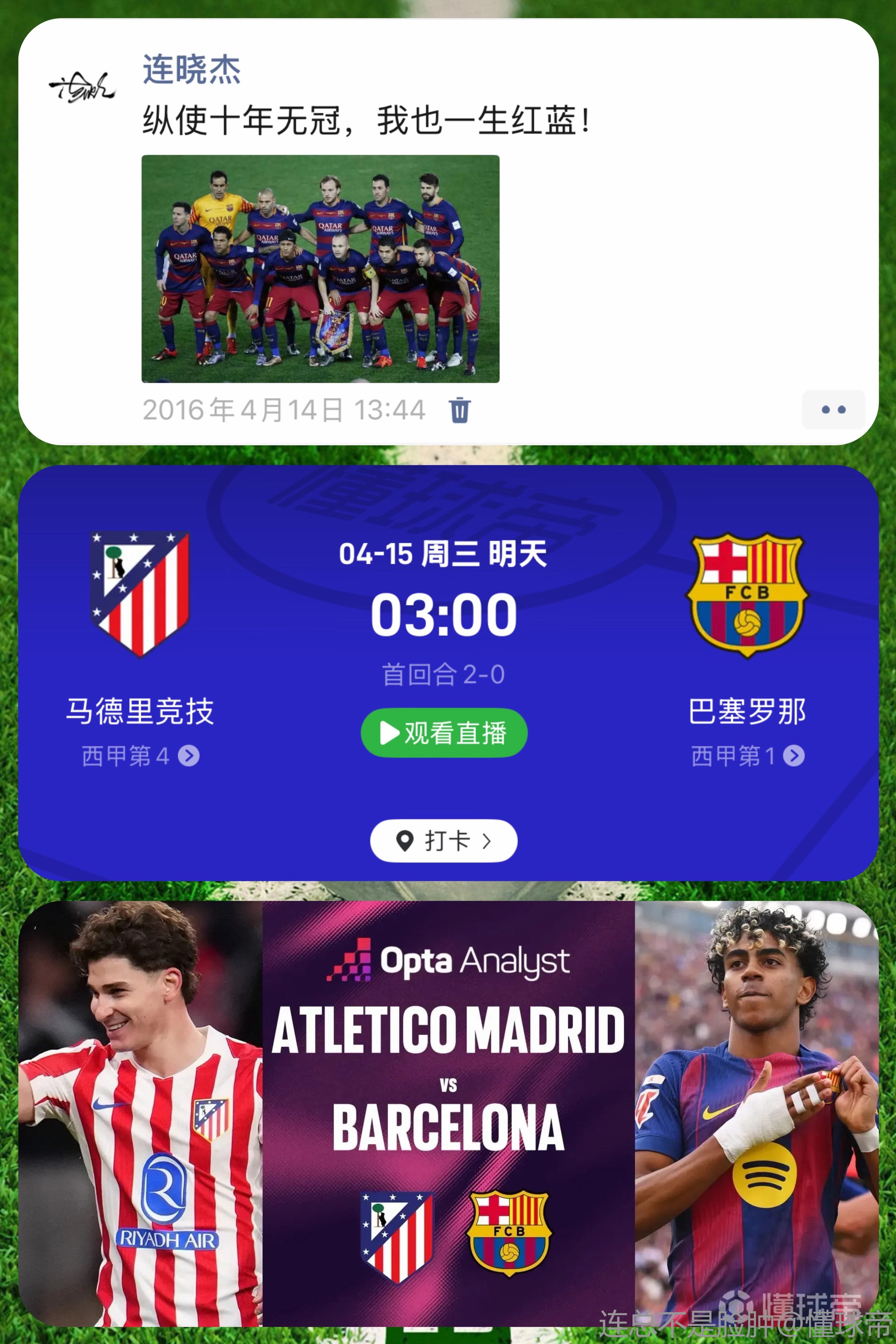 2016年的今天发这条朋友圈时,怎么也没想到这一等就是10年,当年败给马竞,如今还是马竞,十年前可以为了一场欧冠熬到天亮,十年后闹钟都不敢定,怕吵醒孩子,怕影响工作。成长就是这样,收起了冲动,扛起了生活,热爱还在,只是方式不一样。无论结局如何,我都会为这份跨越十年、从未褪色的红蓝信仰喝彩。
