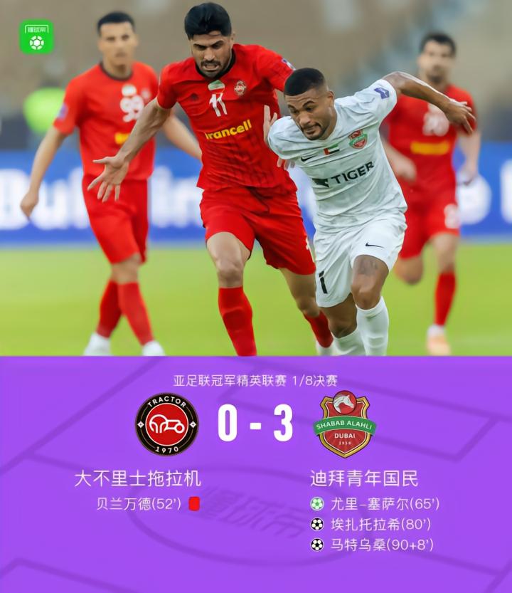 北京时间4月14日亚足联冠军精英联赛 1/8决赛,大不里士拖拉机对阵迪拜青年国民。迪拜青年国民尤里-塞萨尔破门,埃扎托拉希破门,马特乌桑破门。最终比分大不里士拖拉机 0-3 迪拜青年国民,无缘八强。