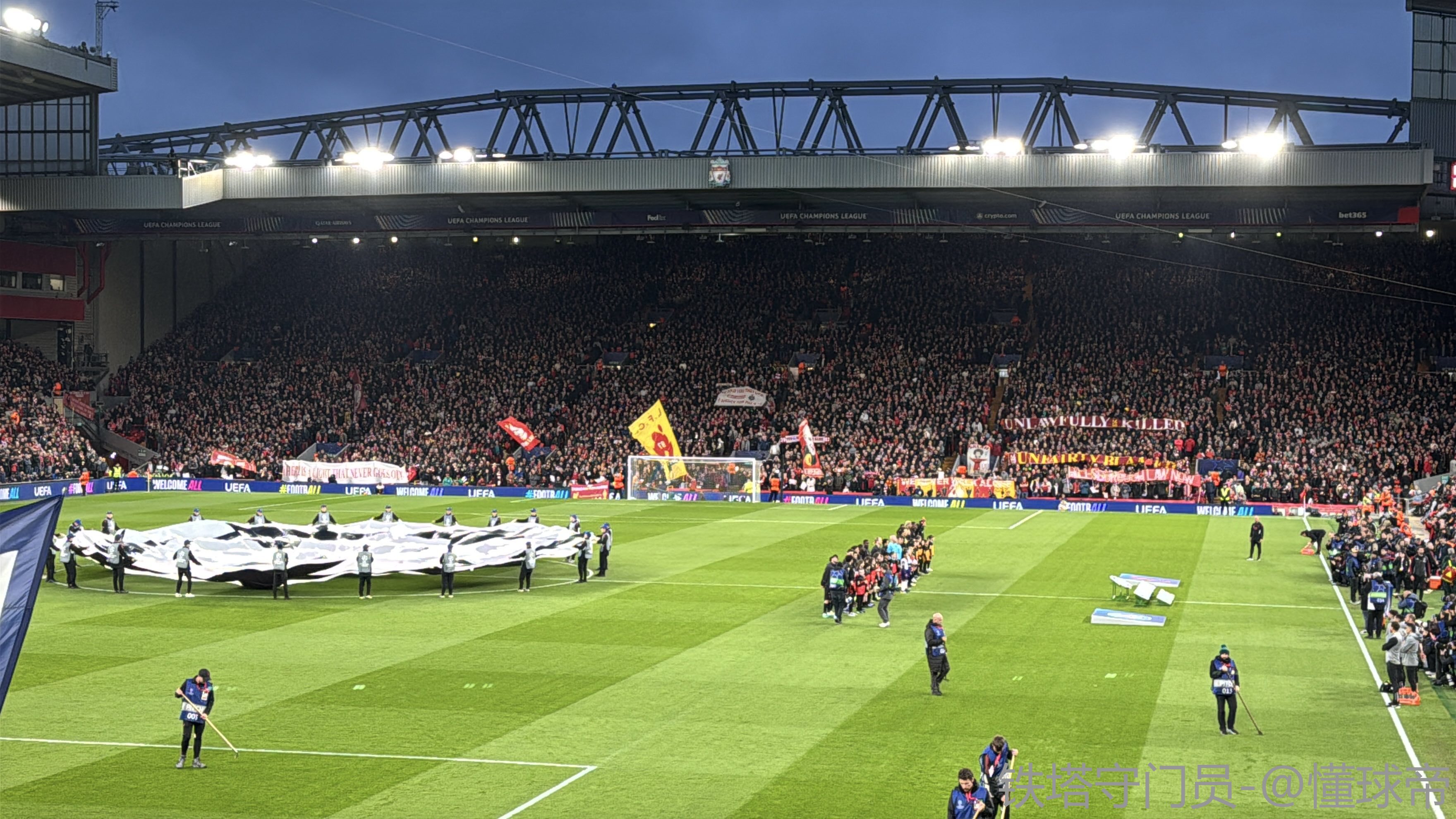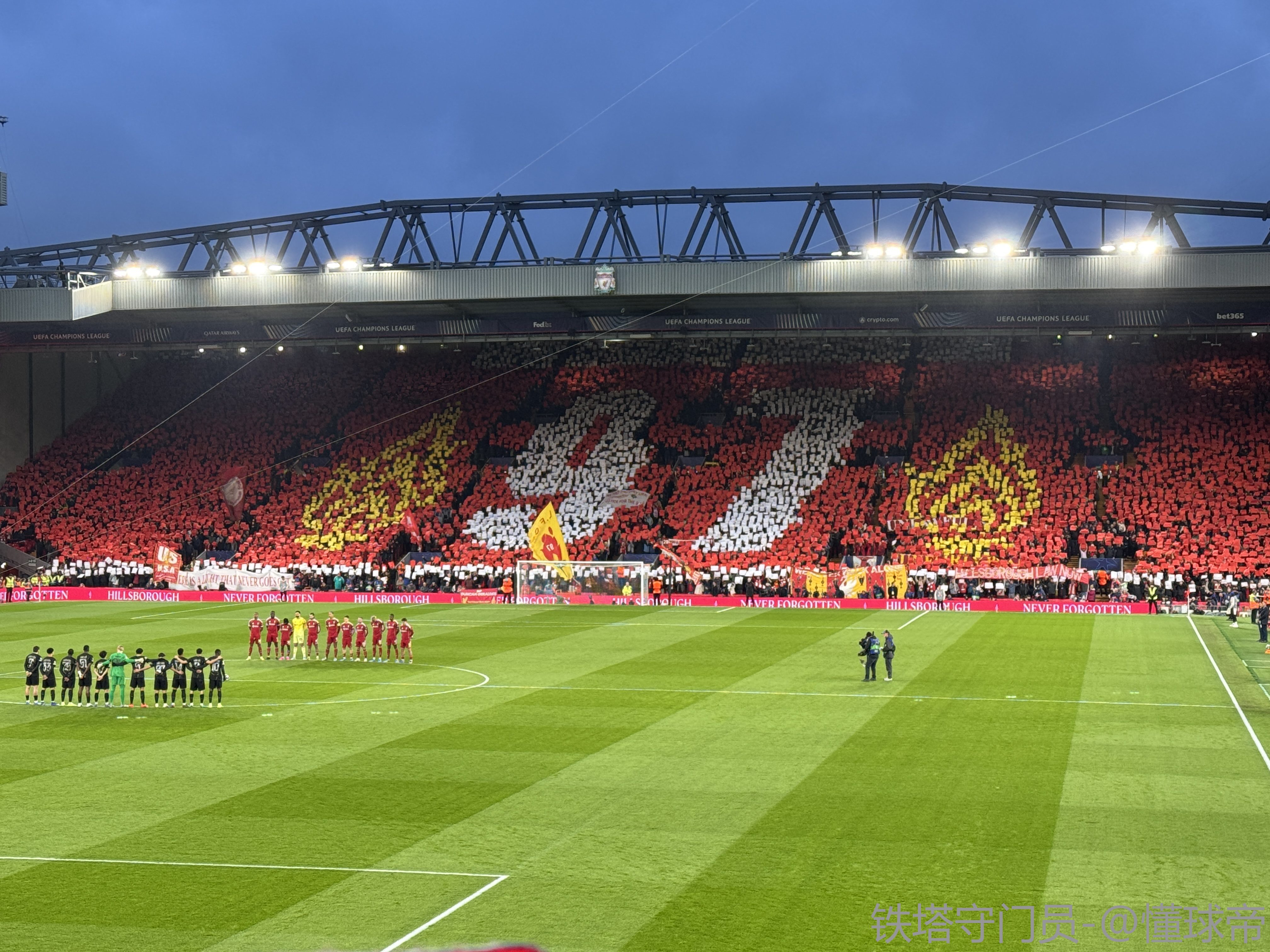 赛前全场为希尔斯堡惨案97名遇难者默哀一分钟。明天4月15日是惨案37周年纪念日,逝者安息