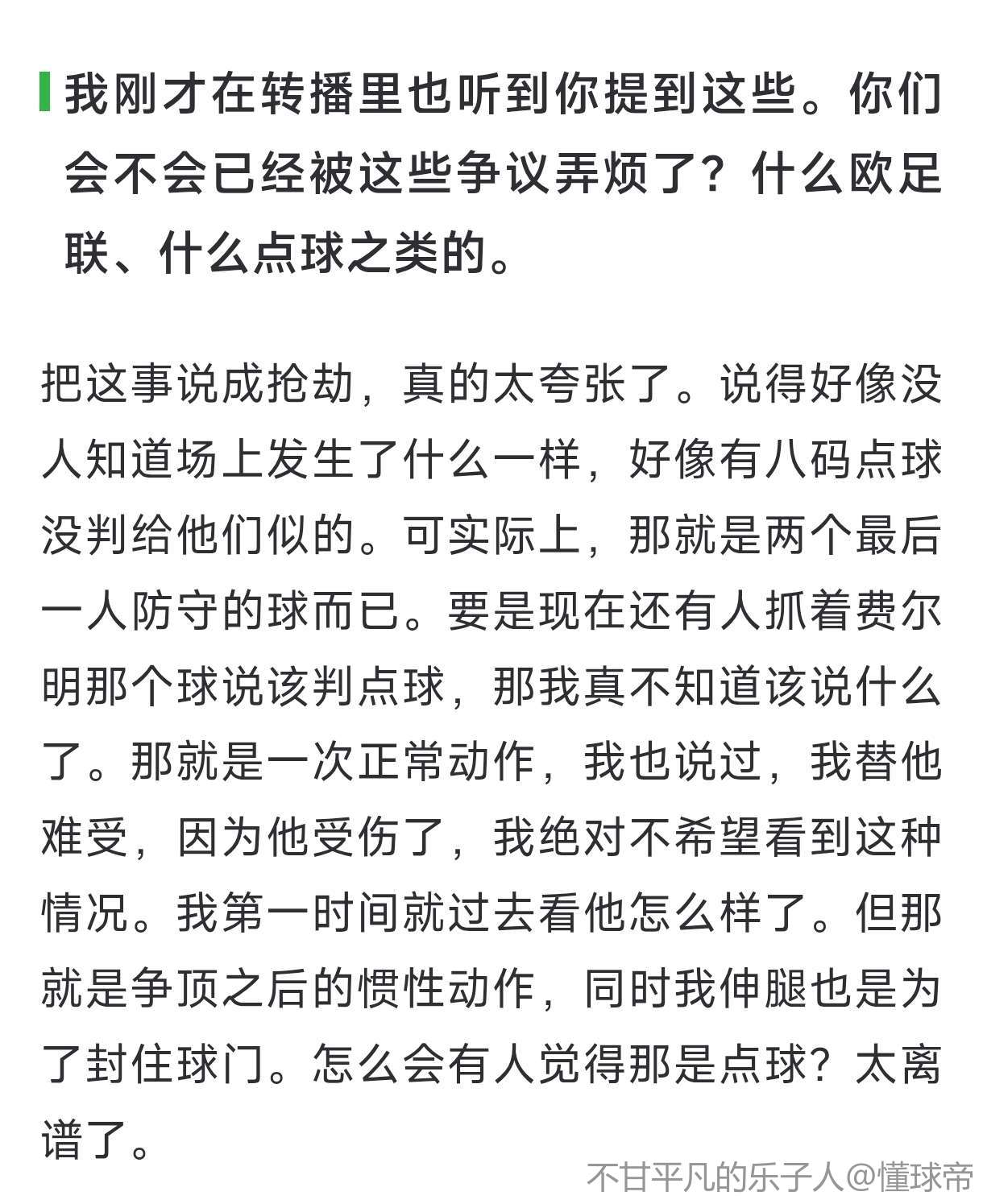 这球一大堆人哭喊穆索犯规的,费尔明自己要头球冲顶,就得承担这一动作的风险,穆索只是一个门将扑球的本能,根本没有伤人的意思