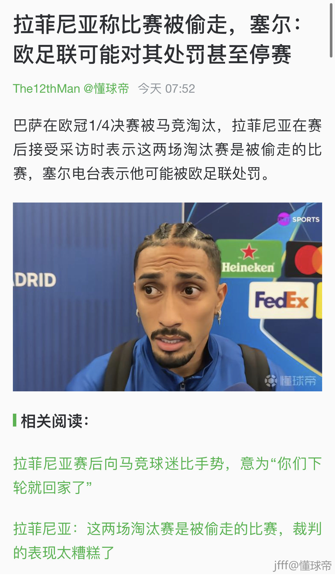 拉菲尼亚称比赛被偷走,塞尔:欧足联可能对其处罚甚至停赛