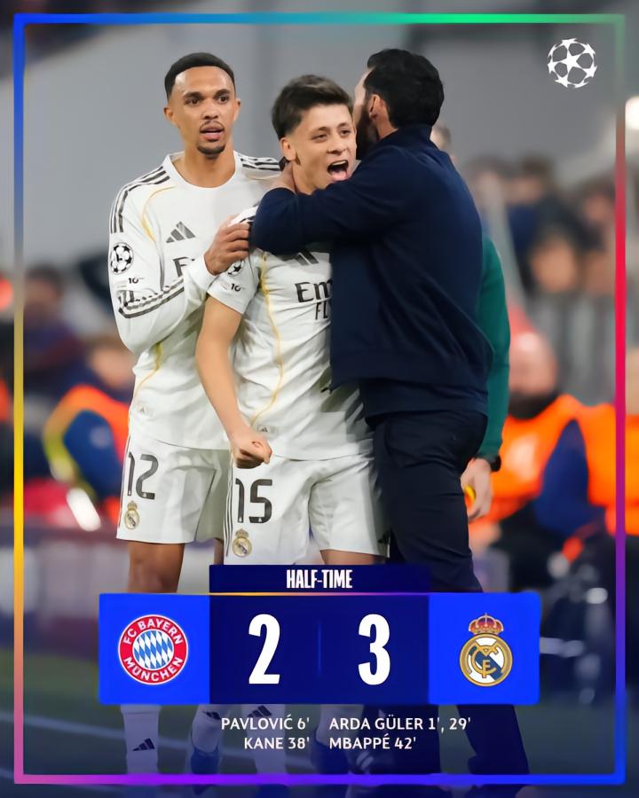 3-4遭拜仁逆转,皇马自2013年以来首次在欧冠半场领先后输球