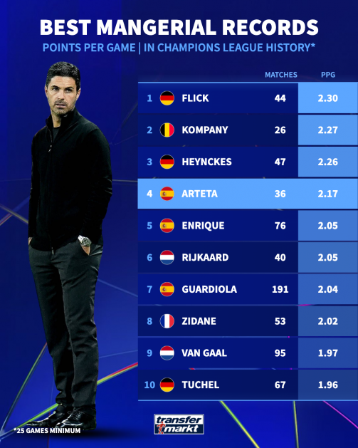 扫描下载懂球帝首页>动态> 懂球号> 24胜6平6负,阿尔特塔欧冠场均2.17分排历史第四!