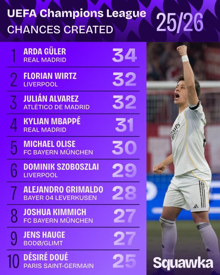 扫描下载懂球帝首页>动态> 本赛季欧冠创造机会榜:居莱尔居首,维尔茨、小蜘蛛并列第二