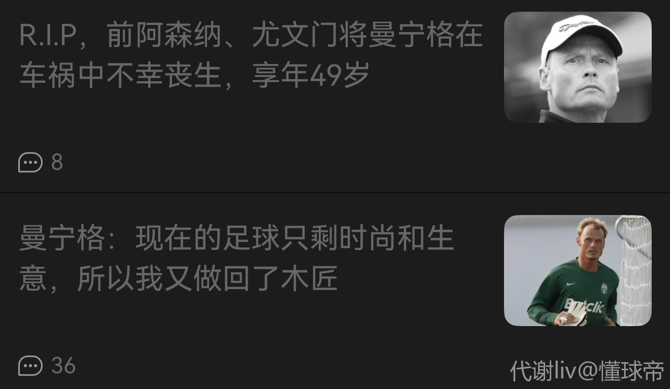 扫描下载懂球帝首页>动态> R.I.P,前阿森纳、尤文门将曼宁格被火车撞击身亡,享年48岁