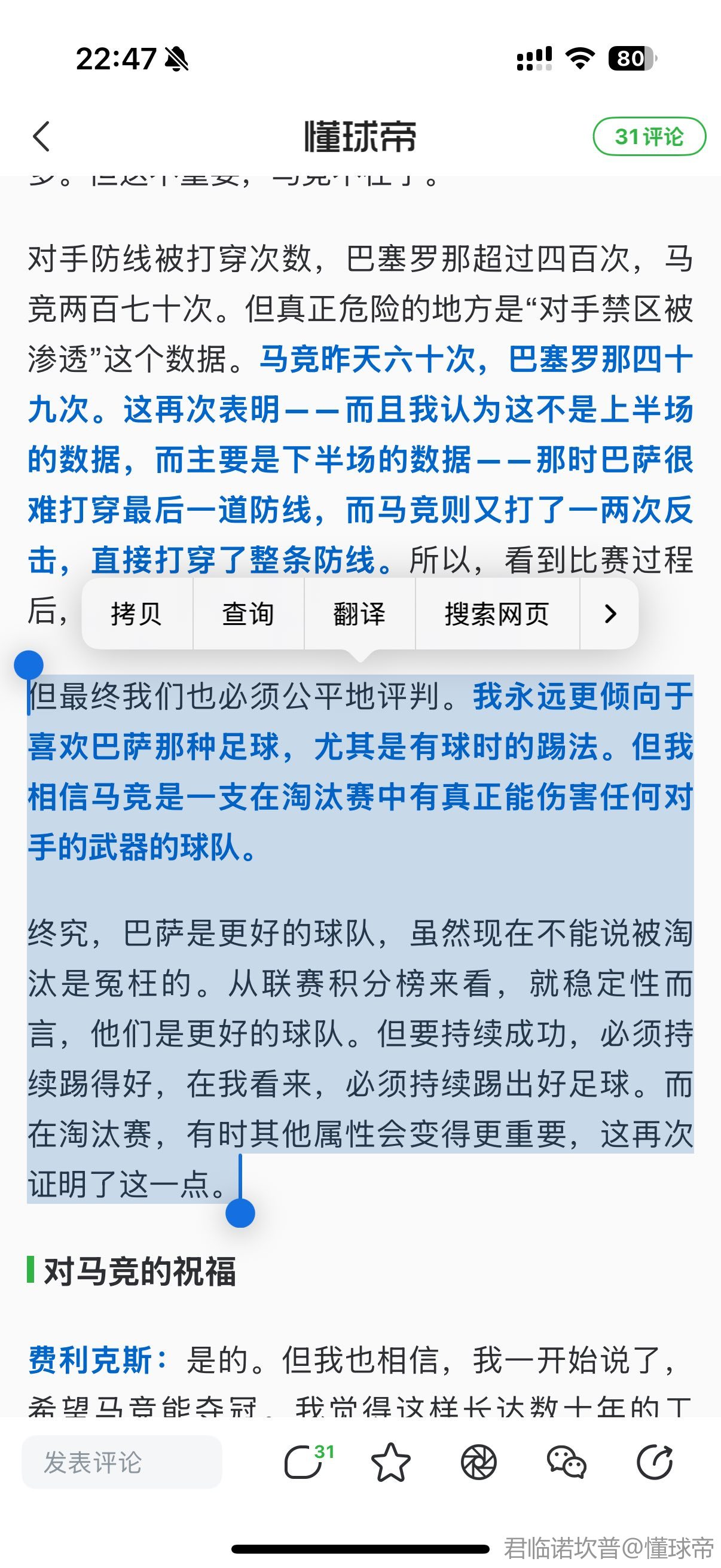 托尼老师太懂球了,比其他的退役名宿的水平不知道高到哪里去了,这一段的评价非常客观,非常精准,也可能是很多巴萨球迷心里想说的话:明明联赛领先马竞这么多,联赛也双杀他们,为什么到杯赛总是差一口气。与其找裁判的问题,不如想想怎么踢的更好更稳定,两回合那么多绝佳机会,为什么没多把握几个