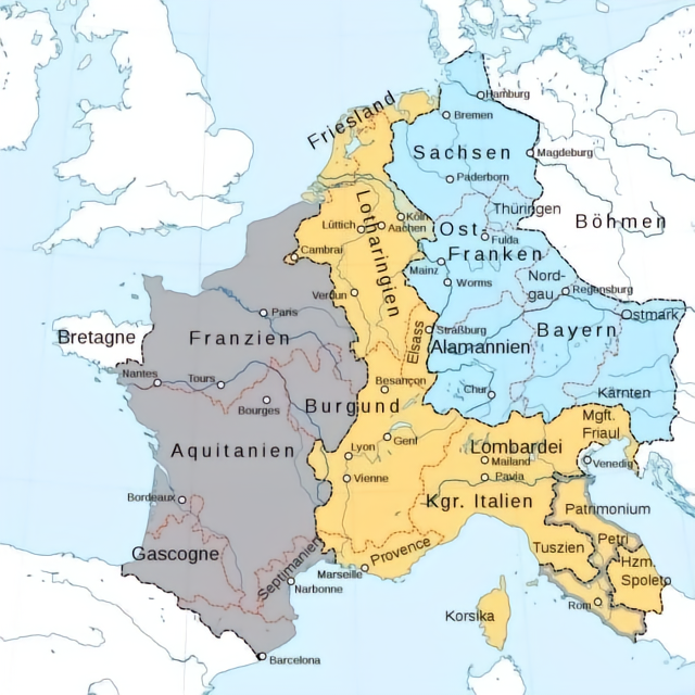 ▲法兰克帝国一分为三,其中蓝色部分为东法兰克,即德意志